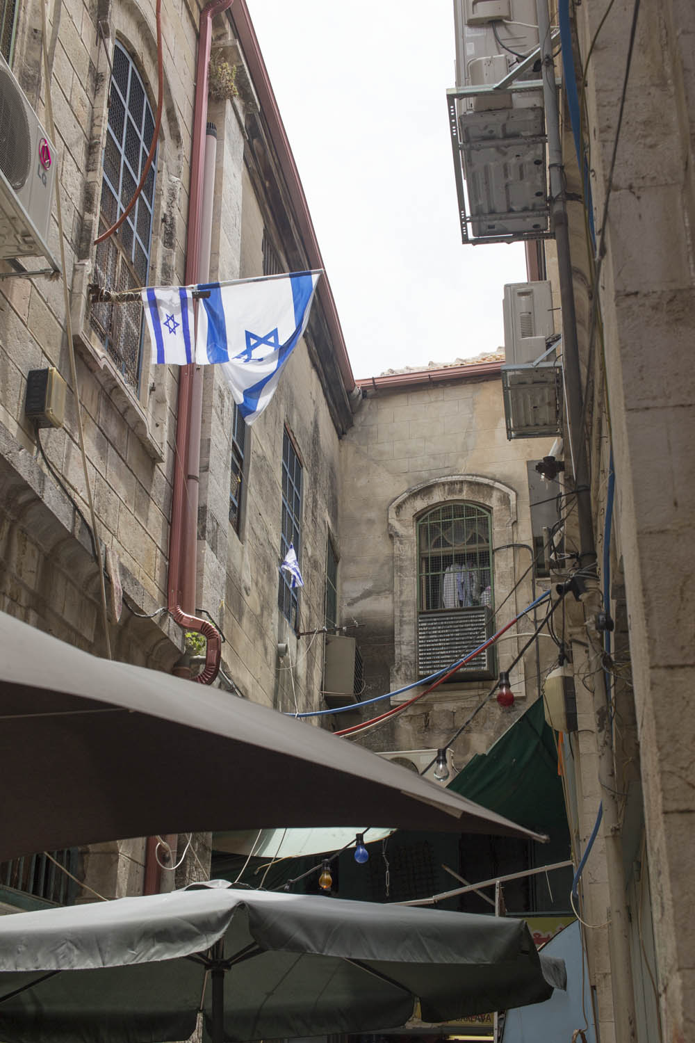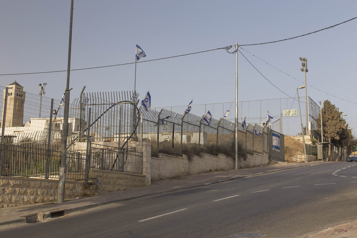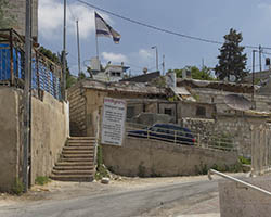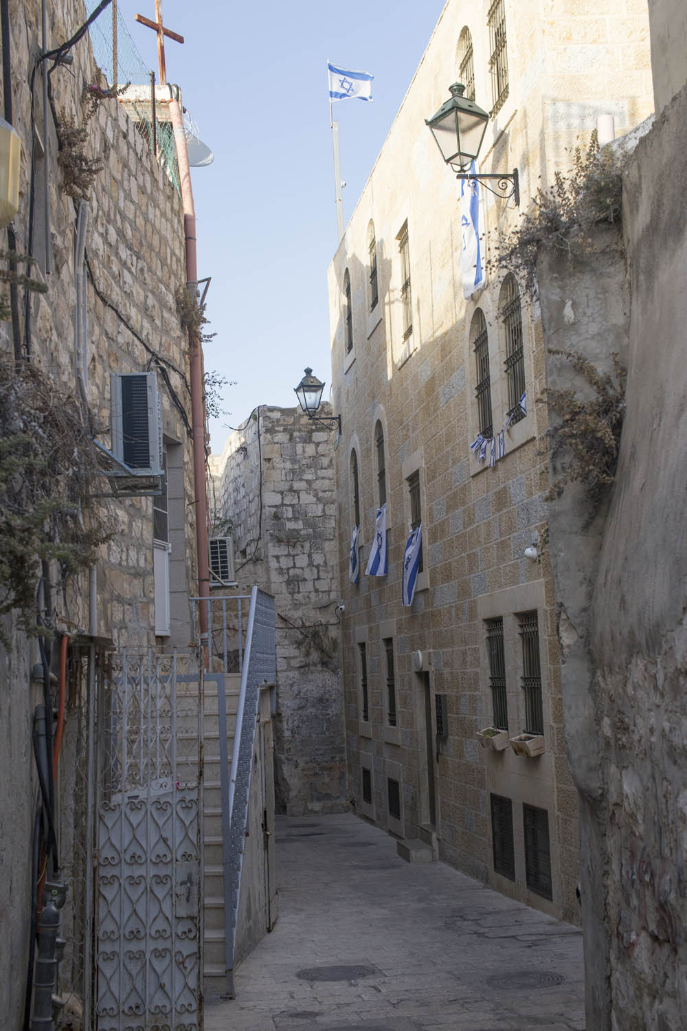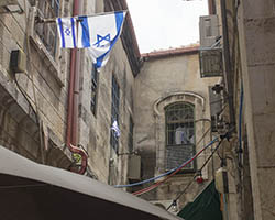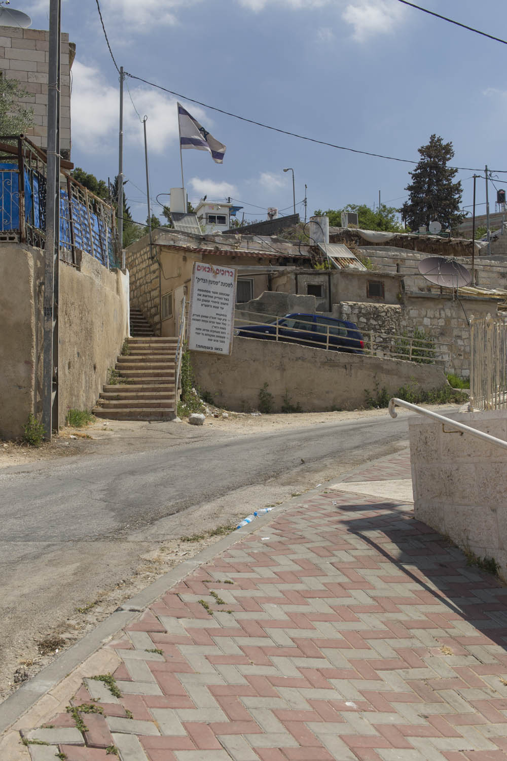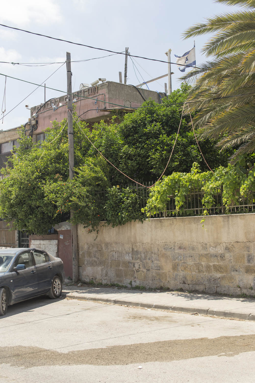 In an attempt to torpedo any peace process that divides Jerusalem according to a two state solution, Jewish settlers move into houses in Muslim or Christian neighborhoods in East Jerusalem. Sometimes these houses are bought through front men, sometimes they are acquired with the help of the Israeli court system. Many of these houses or apartments appear fortress-like, with a whole array of surveillance cameras and secured by heavily armed private guards. It is not in the interest of these inhabitants to have any kind of relation to their neighbors. So even though these houses and apartments appear quite innocent with their cute little flags and can easily been overlooked by the thousands of tourists in Jerusalem, they are an outgrowth of this ongoing and brutal conflict between Palestinians and Israelis.