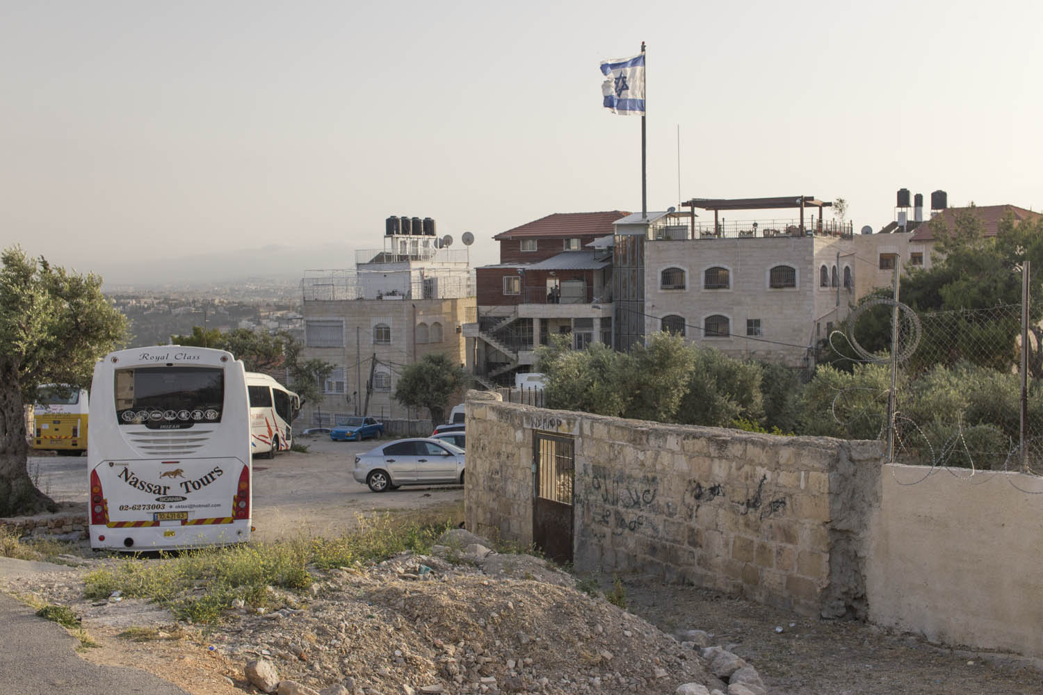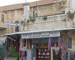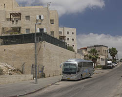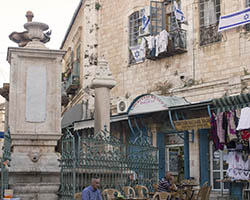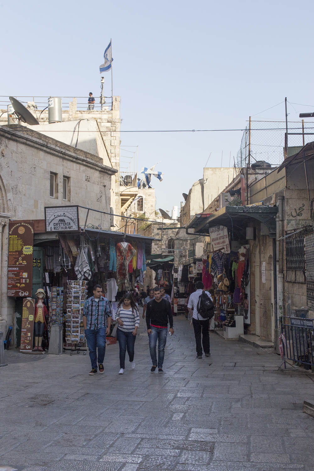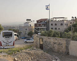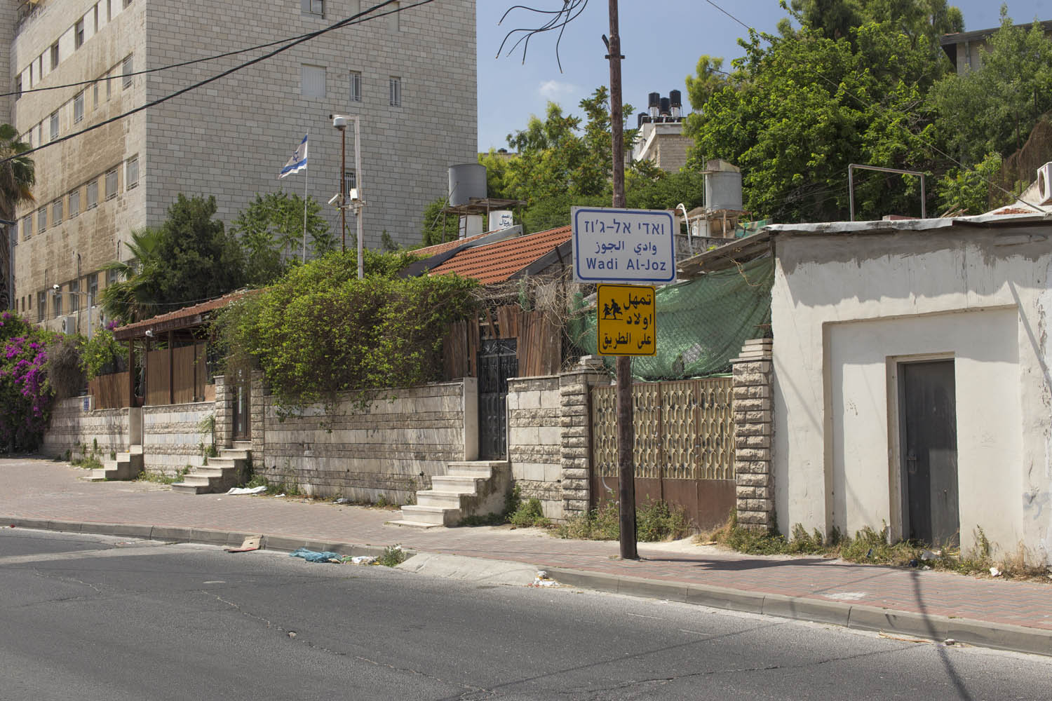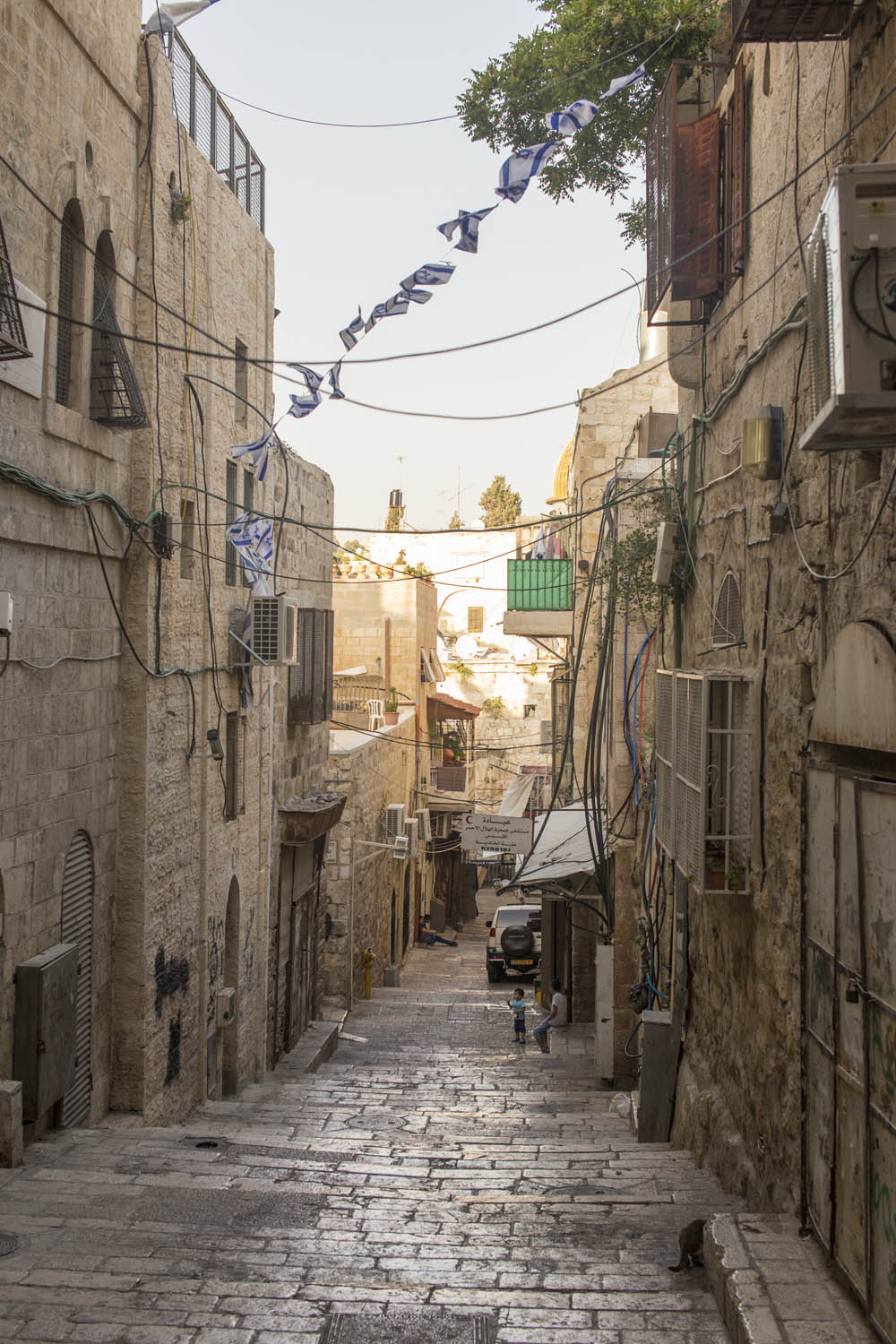 In an attempt to torpedo any peace process that divides Jerusalem according to a two state solution, Jewish settlers move into houses in Muslim or Christian neighborhoods in East Jerusalem. Sometimes these houses are bought through front men, sometimes they are acquired with the help of the Israeli court system. Many of these houses or apartments appear fortress-like, with a whole array of surveillance cameras and secured by heavily armed private guards. It is not in the interest of these inhabitants to have any kind of relation to their neighbors. So even though these houses and apartments appear quite innocent with their cute little flags and can easily been overlooked by the thousands of tourists in Jerusalem, they are an outgrowth of this ongoing and brutal conflict between Palestinians and Israelis.