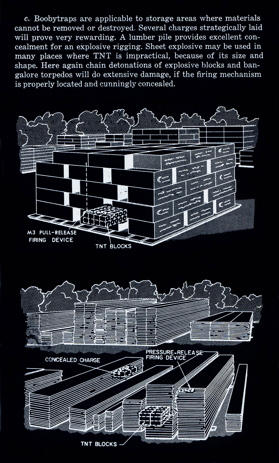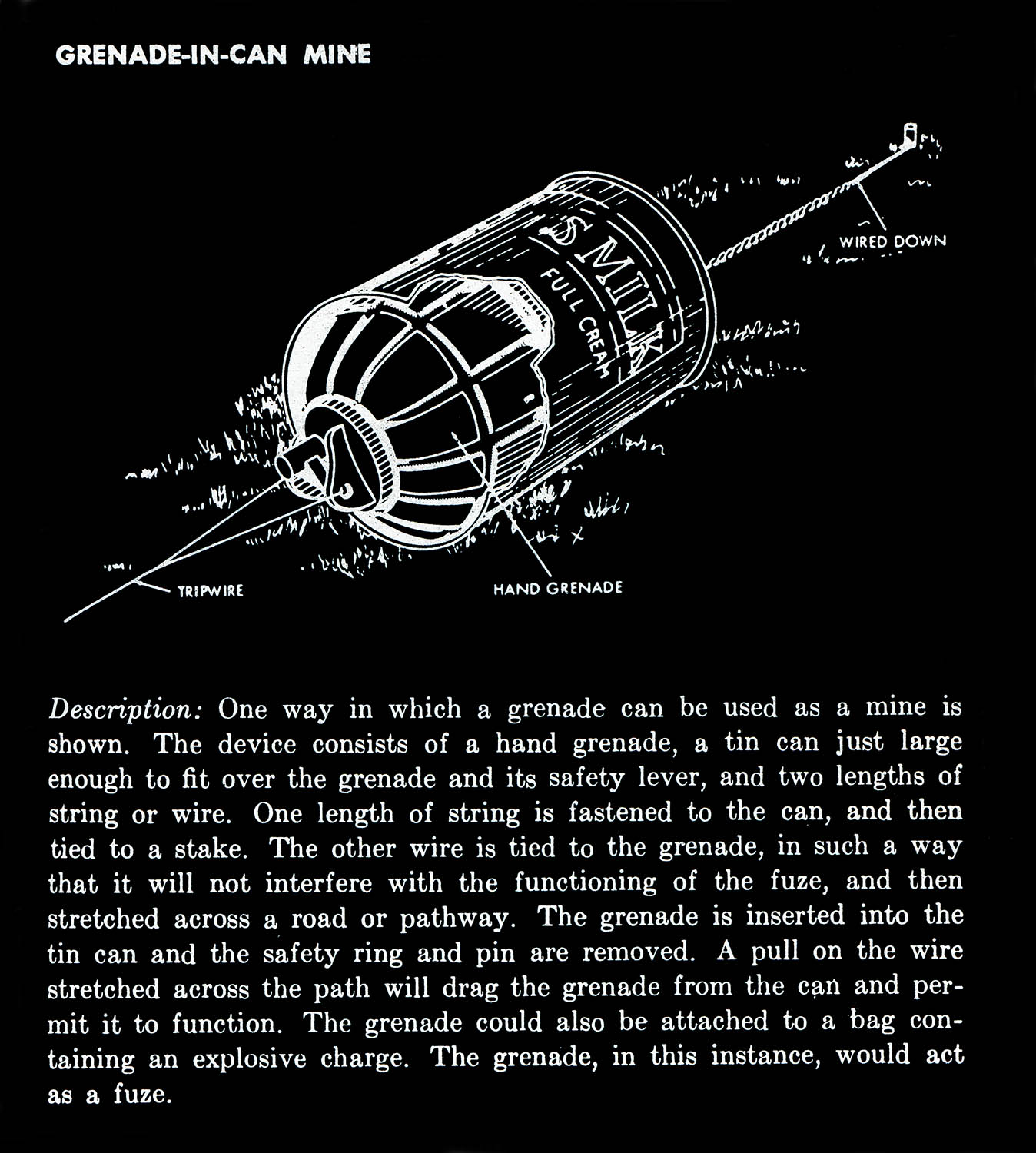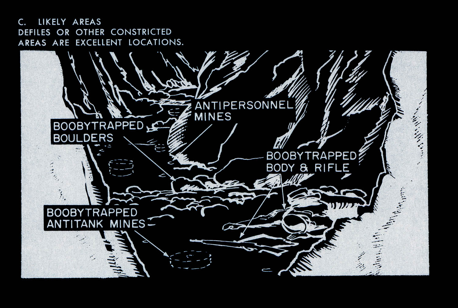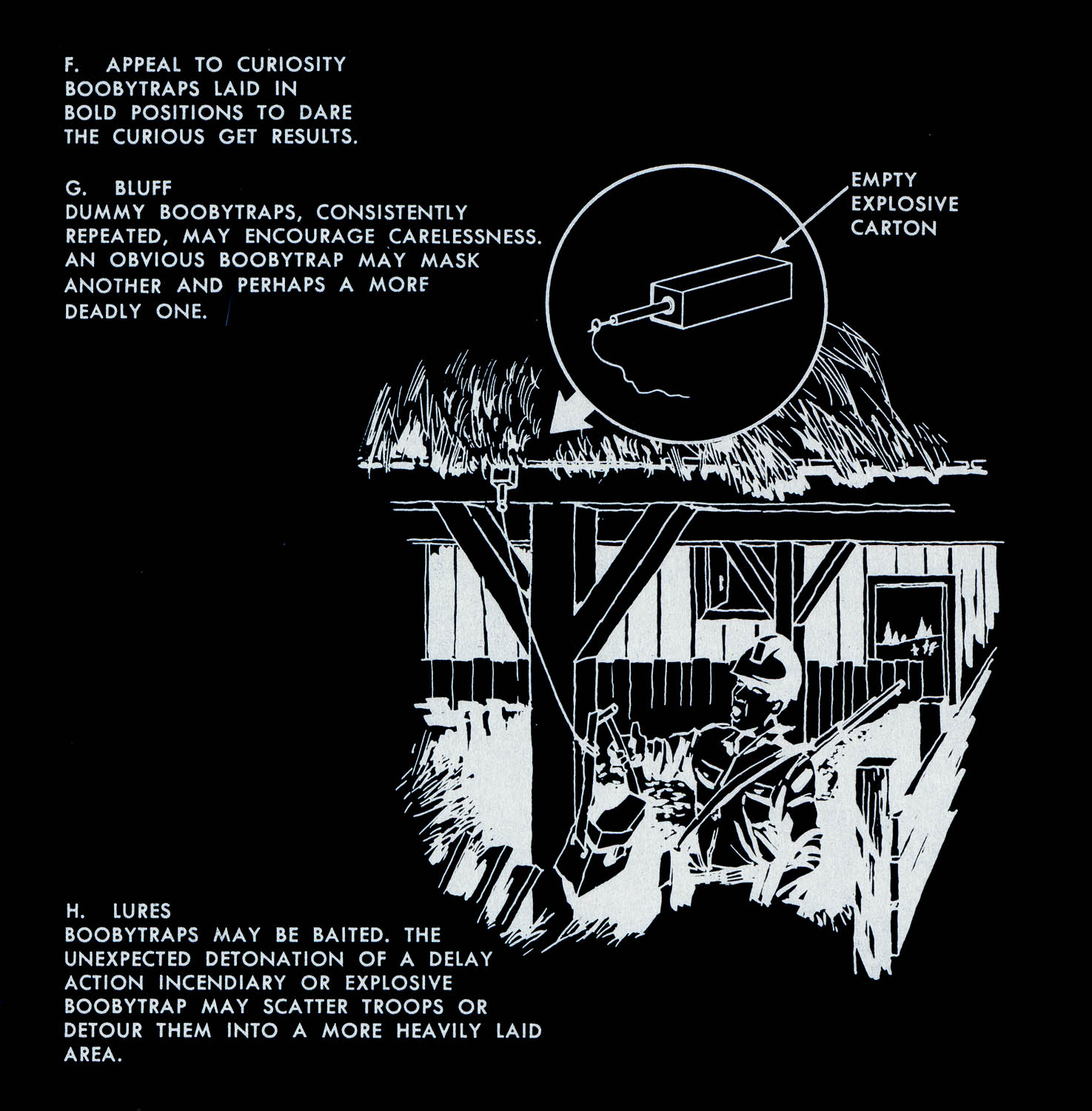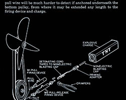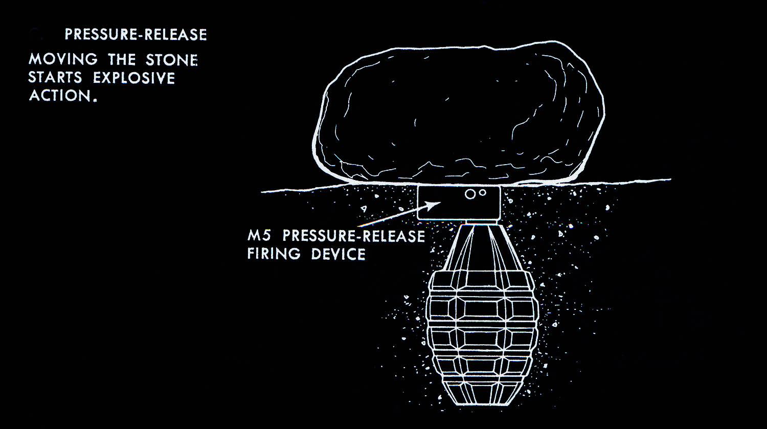 The images of this series are based on illustrations from two books “Boobytraps” (1965) and “Unconventional Warfare Devices and Techniques - References” (1966). These two so-called “Army Field Manuals” by the US-Army are handbooks that help teaching soldiers the skills of warfare, they instruct them how to use and construct boobytraps.