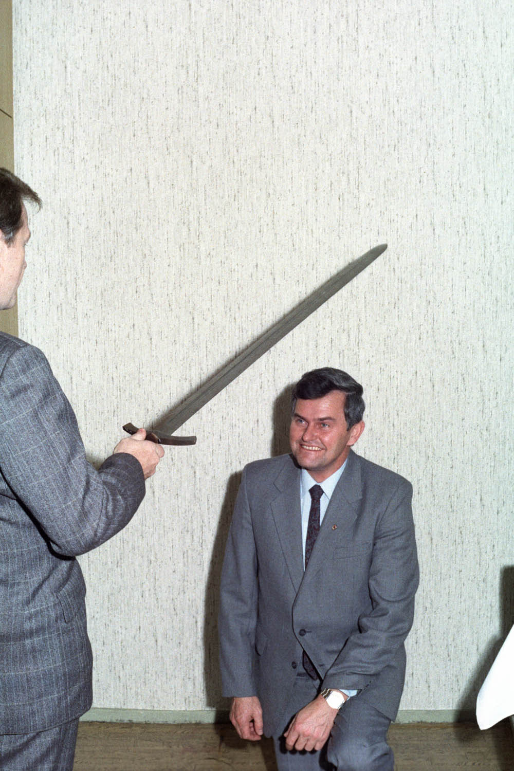 Not a completely standard awards ceremony. Unfortunately, the text on the certificate that is being handed over is illegible.