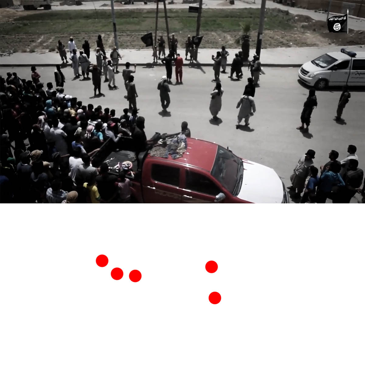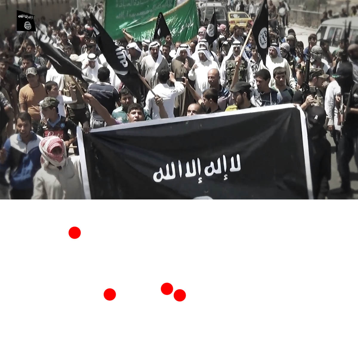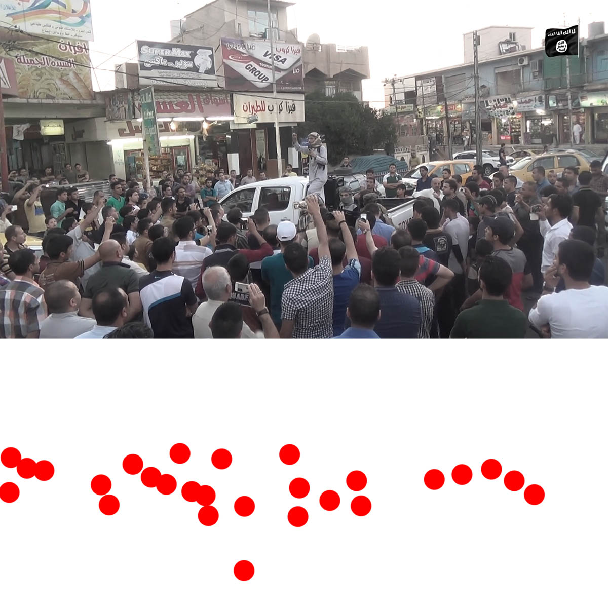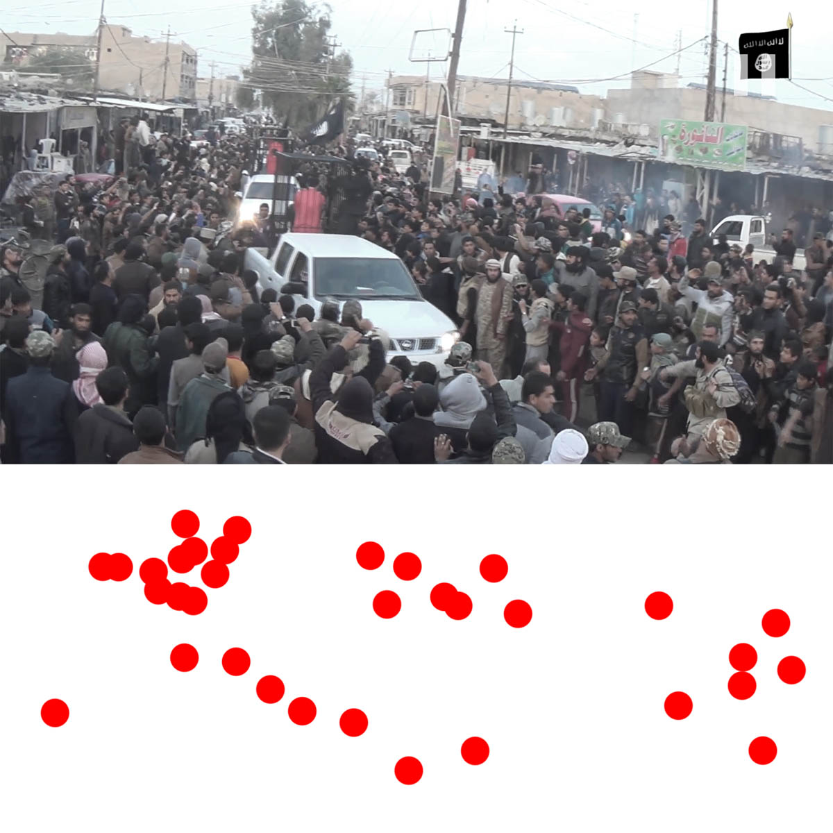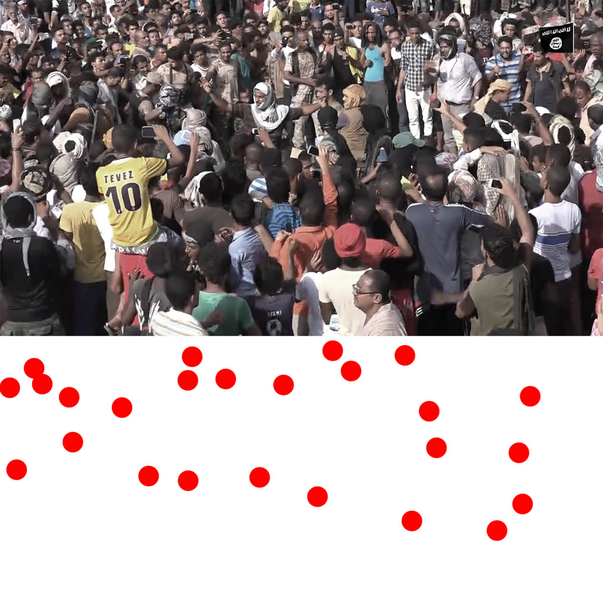 Aniconism – or the prohibition by some interpretations of Islam against the depiction of sentient beings – used to be a key point in the doctrine of some of the most radical Islamist groups. Apparently that is long gone. In this ongoing project I am collecting stills from Islamist propaganda videos depicting large crowds. The red dots indicate the persons filming the scenes with their phones.