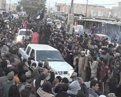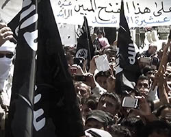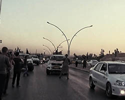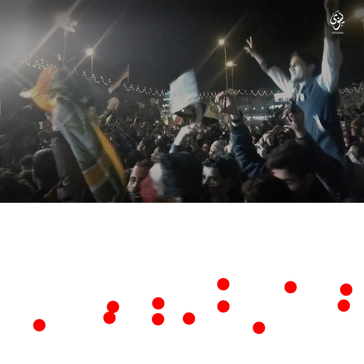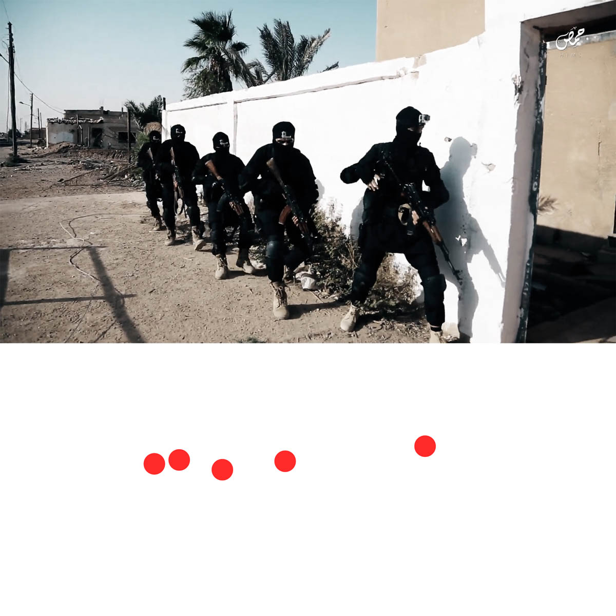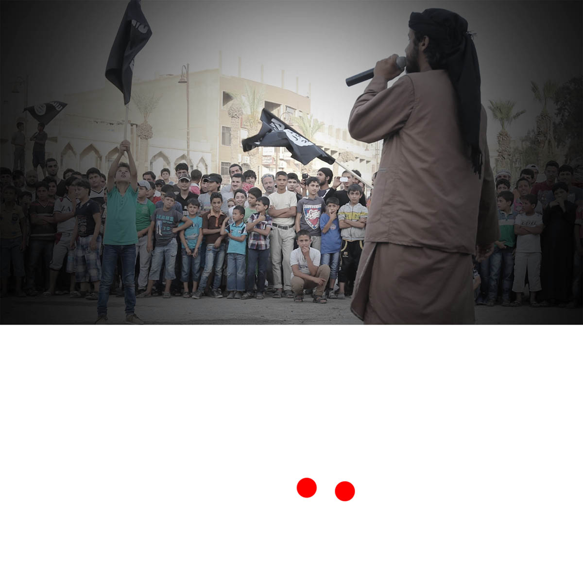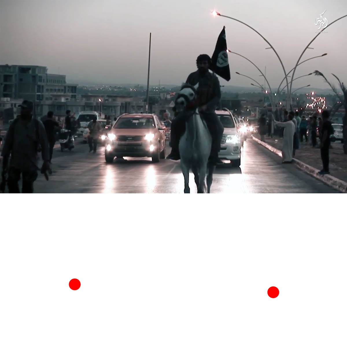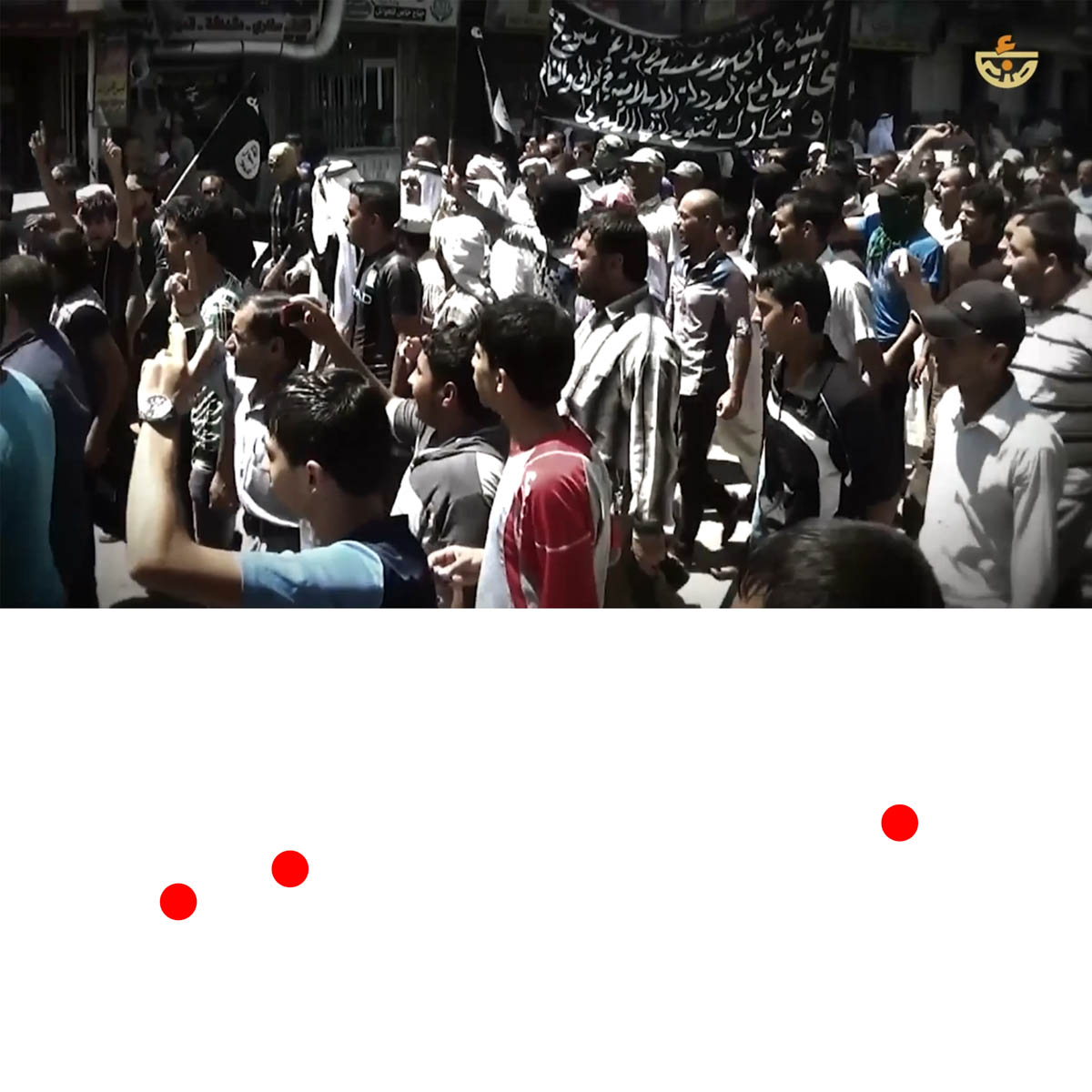 Aniconism – or the prohibition by some interpretations of Islam against the depiction of sentient beings – used to be a key point in the doctrine of some of the most radical Islamist groups. Apparently that is long gone. In this ongoing project I am collecting stills from Islamist propaganda videos depicting large crowds. The red dots indicate the persons filming the scenes with their phones.